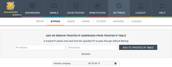 A trusted IP allows mail sent from the specified IP to pass through MWES without filtering.