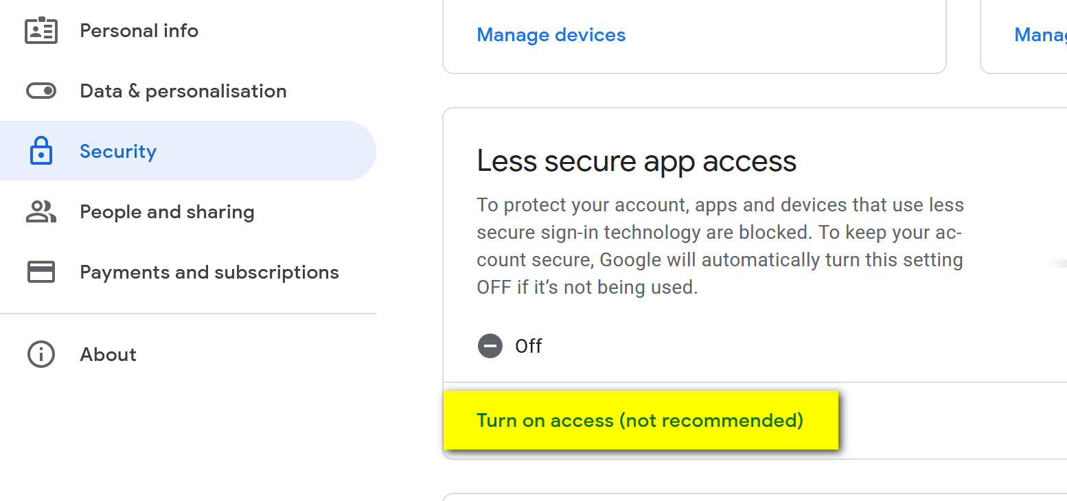 3. Click the slider so it reads less secure apps: ON (The slider doesn't actually slide on)