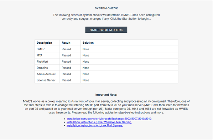 cd mwes-xxxx then run script ./install as "root" cd /etc/init.d then run script ./mwesd start STEP TWO Change the listening SMTP port from 25 to 26 for your mail server. (MS Exchange users see the instructions above as these are different for each version of MS Exchange) STEP THREE On completing the installation, a browser window will launch taking you to the Setup Wizard at http://localhost:4044 Click the Start Configuration Wizard button to begin setup. ![]() A. First you are asked to change your administrator password. This account will allow you to control the administration privileges. Do not give this out to users. ![]() B. Next, enter all the domains you want to filter email through. ![]() C. Now, change any of the default settings if needed. Most of the time you can leave the 'Hostname' blank so it will bind to all interfaces available. Note: If you want to provide a daily emailed digest of blocked email to users, you'll need to enter a domain for the Web Hostname. Users will then be able to retrieve email from http://companydomain.com:4044 ![]() D. Finally, you are shown the thank you screen. Press Finish to begin the System Check. ![]() E. Upon completing the wizard you will be taken to the System Check screen to ensure you have setup your system correctly to work with MailWasher Server. Press the Start system check button and MailWasher Server will run through its connectivity tests. ![]() F. If there is a problem, MailWasher Server will notify you and suggest a fix. See step (4) below regarding ports or contact us at support. ![]() G. If your setup is correct, MailWasher Server will notify you it has 'Passed' all tests. STEP FOUR Make sure ports 25, 4044, 4051 and 80 are not firewalled as MailWasher Server uses these ports. Emails will arrive through port 25 and be checked by MailWasher Server. If email is not quarantined it will then be passed onto the mail server through port 26. |